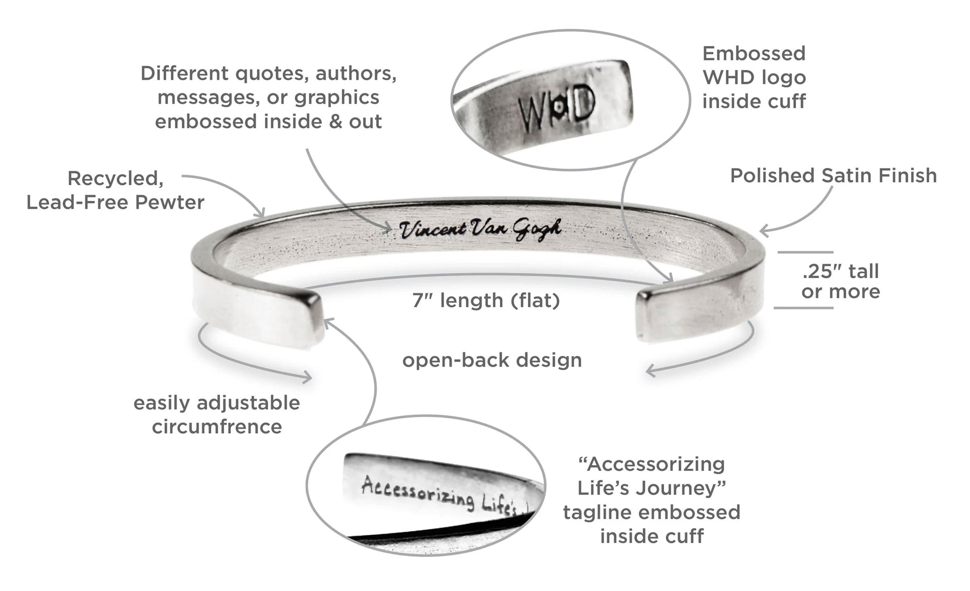 Quotable Cuffs are open bracelets bearing a slogan or inspiration.
